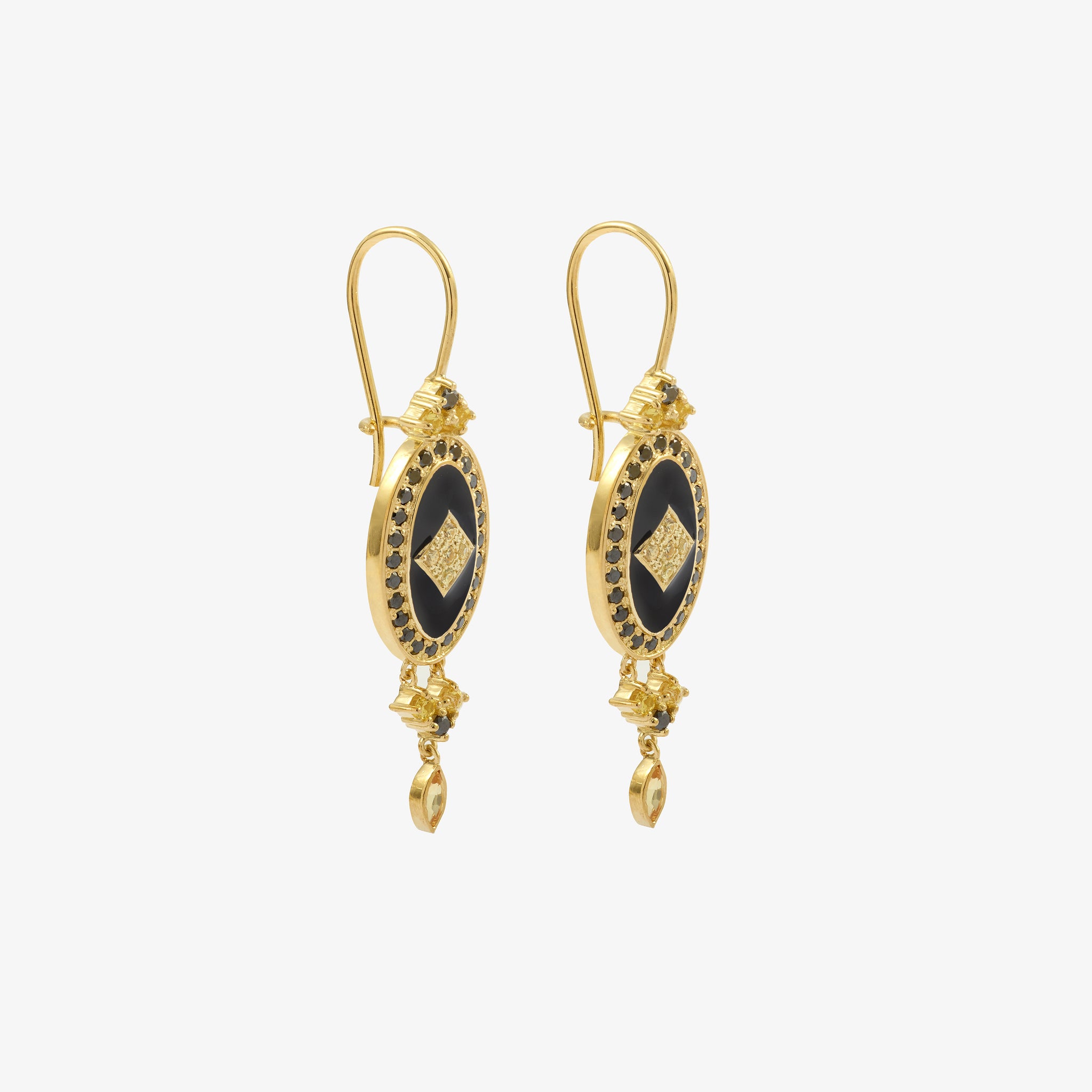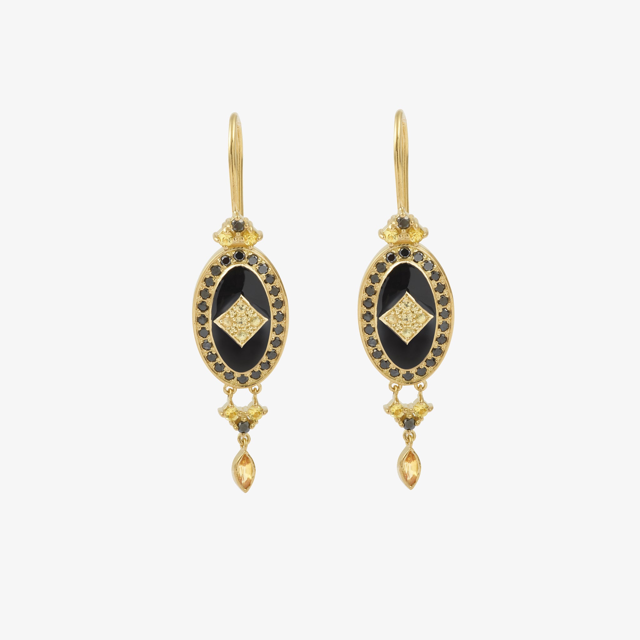 These drop earrings are inspired by the charm of vintage jewelry. A resolutely vintage oval shape with an intense black enamel enhanced by a subtle combination of black diamonds and yellow sapphires. Light and elegant, the Athéna Enamel earrings 1 Yellow are full of character.