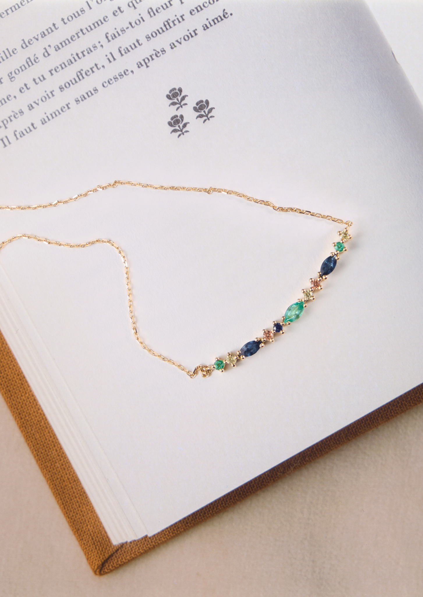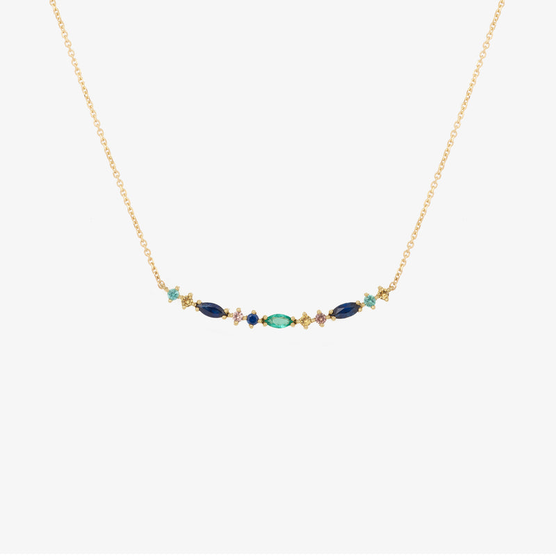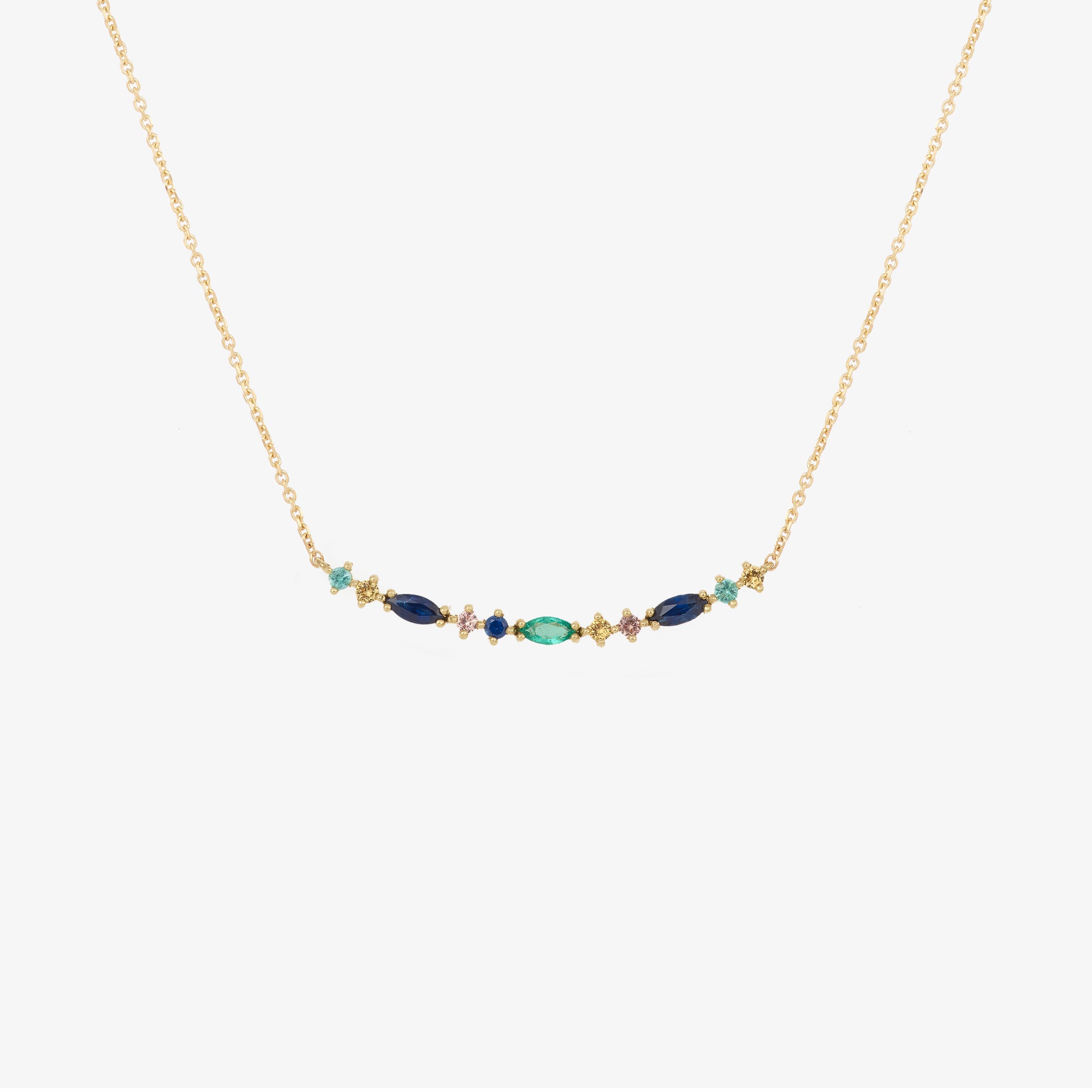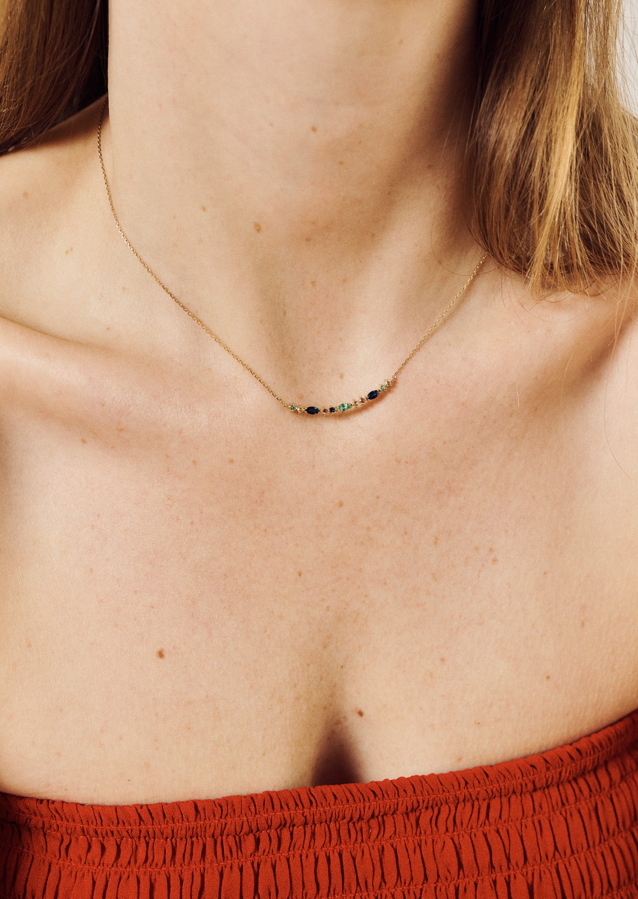 Joyful and sparkling, the Gaia necklace Green is a timeless piece. A slightly curved gold pendant, fitted with precious stones with mineral hues. The Gaia necklace blends harmoniously with other necklaces, an opportunity to play with lengths and shapes.