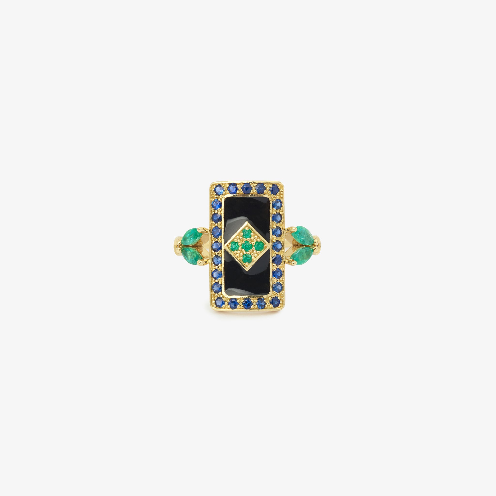 Elegant and feminine, the Ava ring 3 Enamel Green brings the Art Deco look back into fashion. The precious stones contrast with the deep black enamel brilliantly. With its bright mosaic of colors, this ring showcases a resolutely modern and sophisticated style.