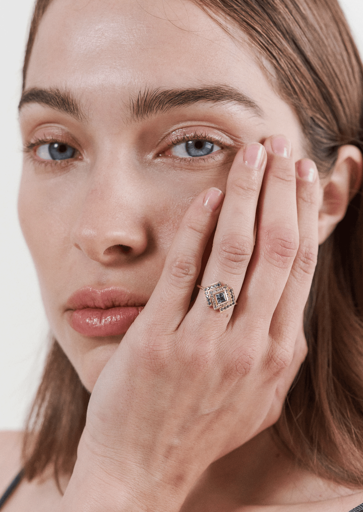 Graphic and luminous, the Ginger 6 ring sparkles. Lozenges of salt-and-pepper diamonds and green sapphires whose color changes with the sun, enhanced by an azure blue sapphire. An elegant and easy-to-wear creation for everyday wear, perfect as a birthday present or an engagement ring.