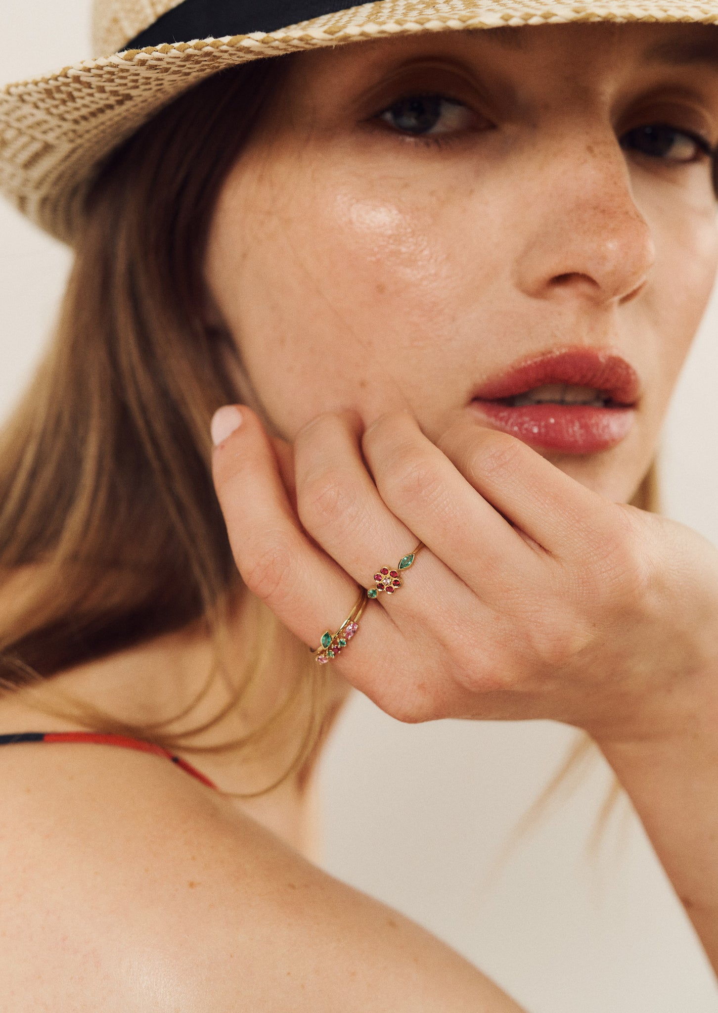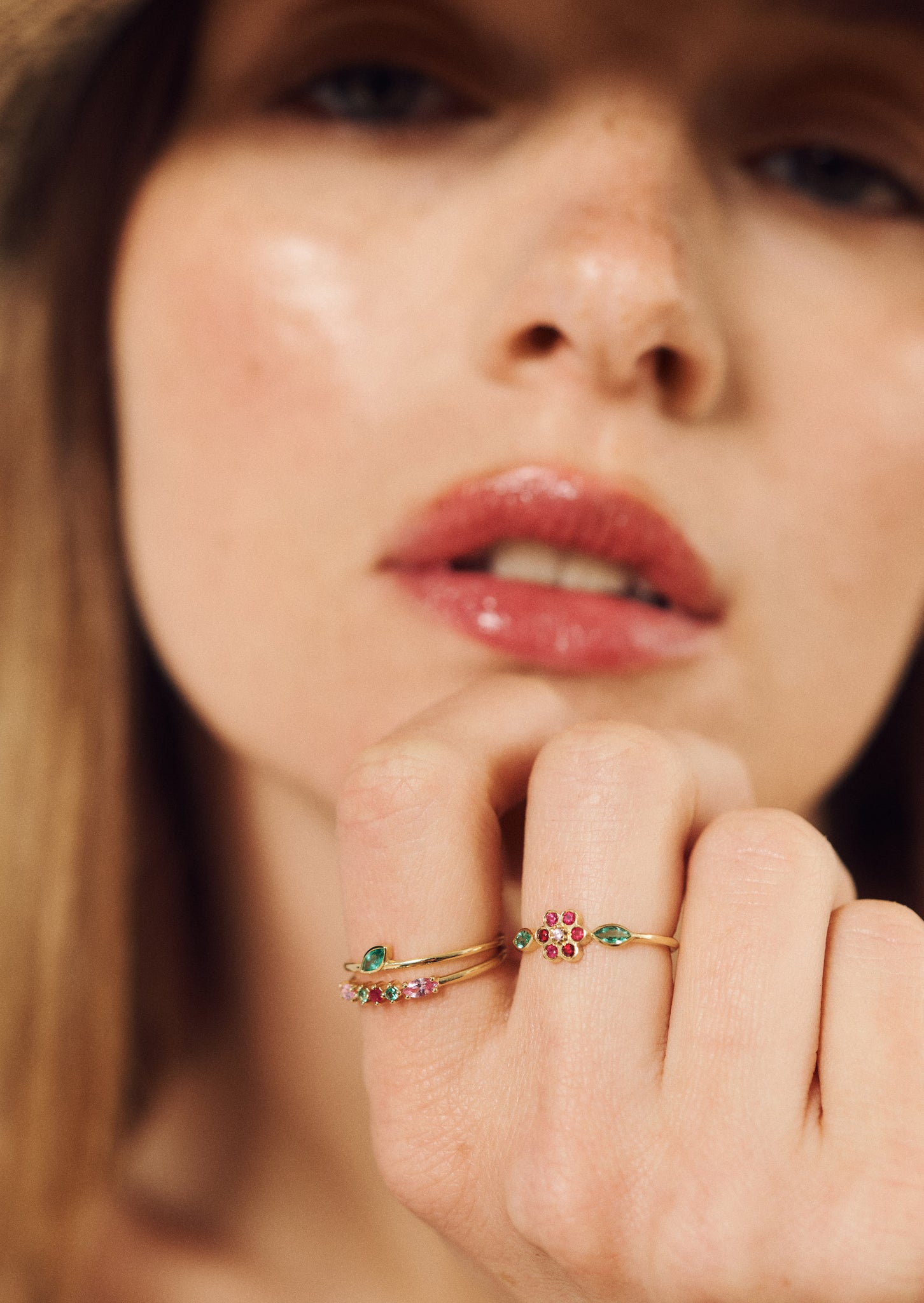 The Miniflower ring 1 is handmade in yellow 18-carat gold and set with 6 rubies, 1 pink sapphire and adorned with 2 Marquise-cut emeralds.