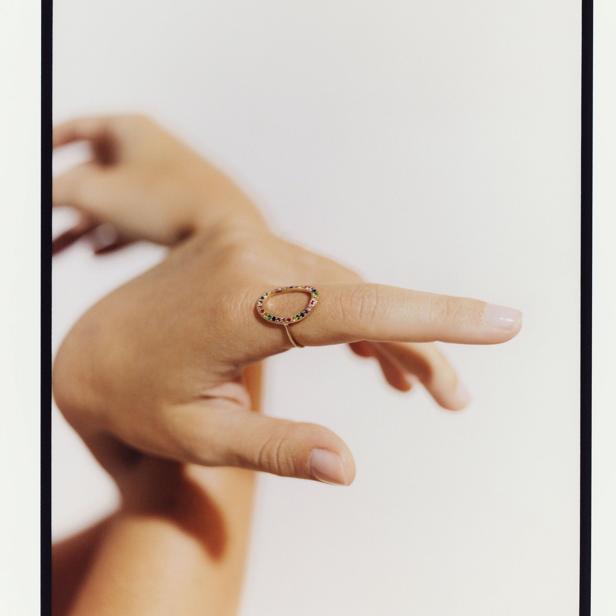 A delicate gold ellipse set with multicolored precious stones. The Rainbow oval ring will adorn your finger while underlining its beauty with its open frame. This model is particularly elegant on the middle, ring, and index fingers.