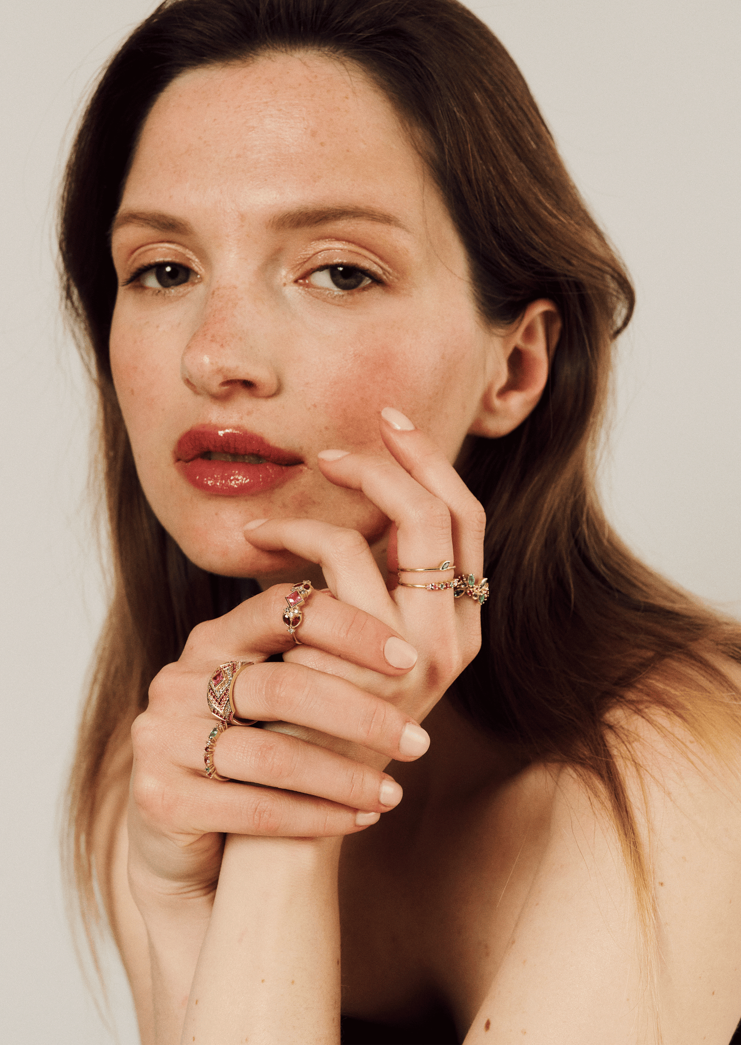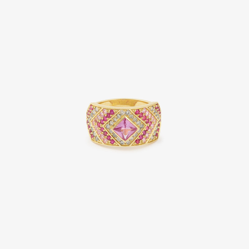 The Ani 2 ring is adorned in a subtle palette of pink, illuminated by sparkling salt-and-pepper diamonds. Its central pink sapphire is surrounded by a constellation of precious stones. A ring with character for everyday wear.
