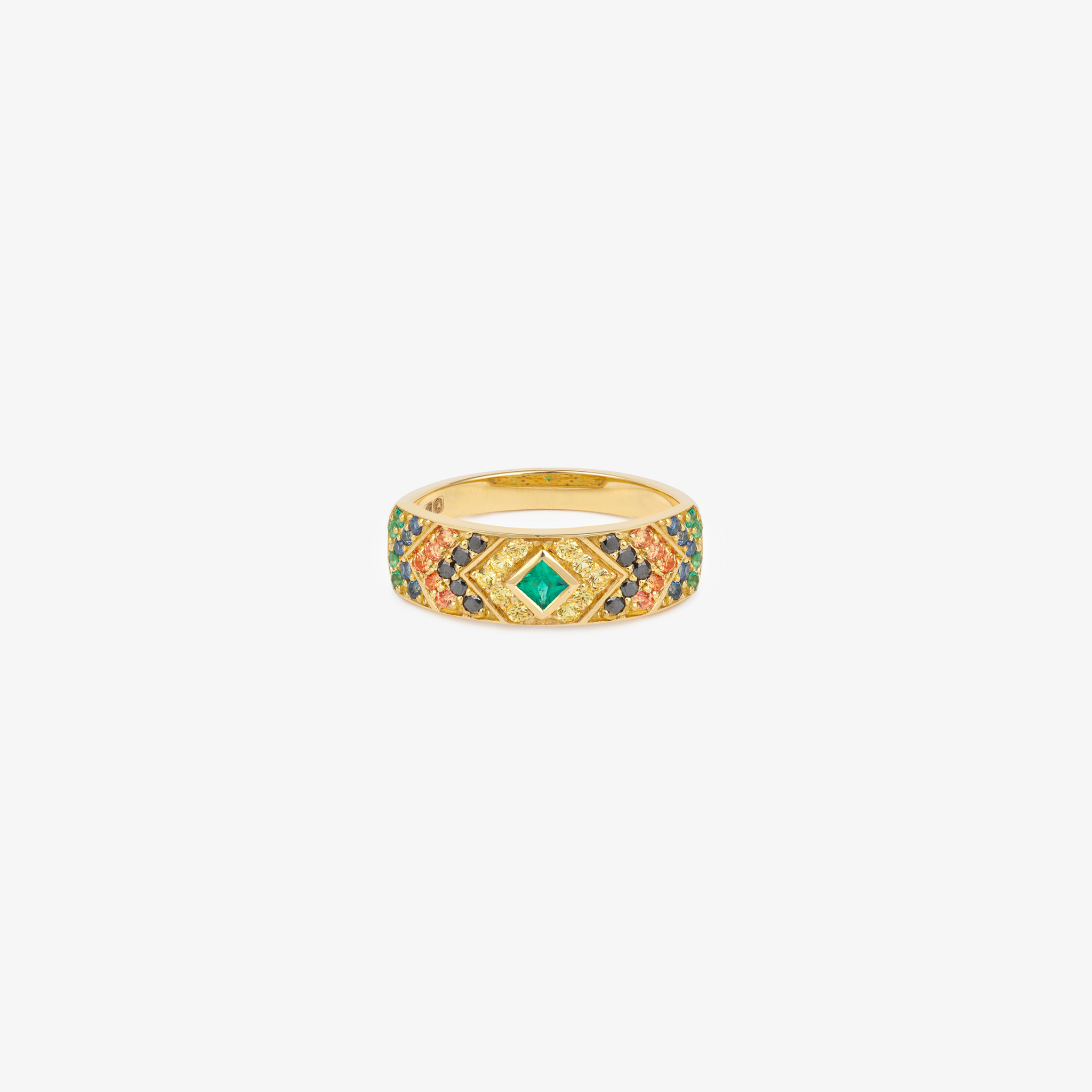 The Ani 3 Green ring showcases a harmonious palette of greens, blues, and cognac, enhanced by black diamonds. Its central emerald is surrounded by a constellation of dazzling gemstones. A bold piece, perfect for adding a touch of character to your everyday look.