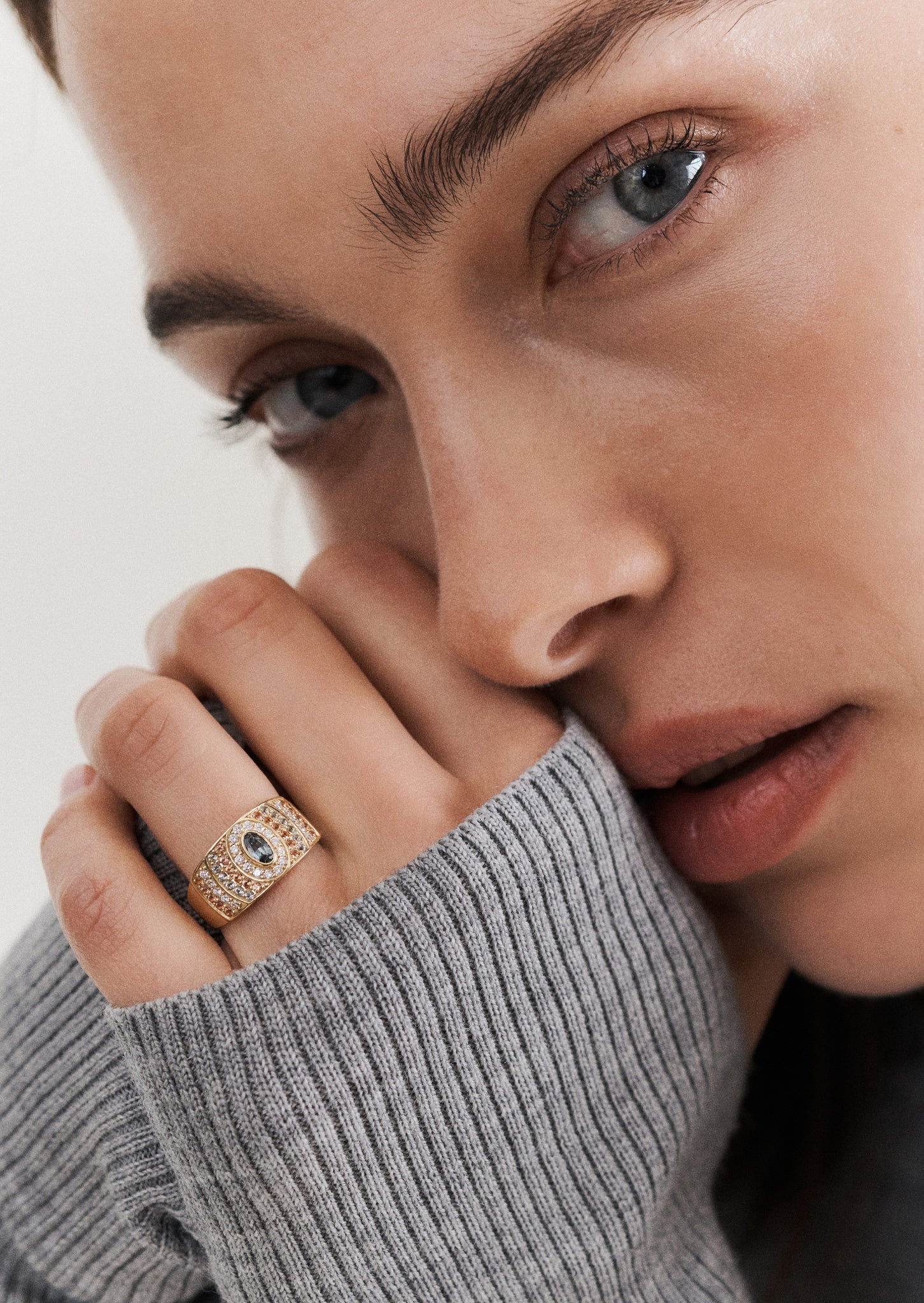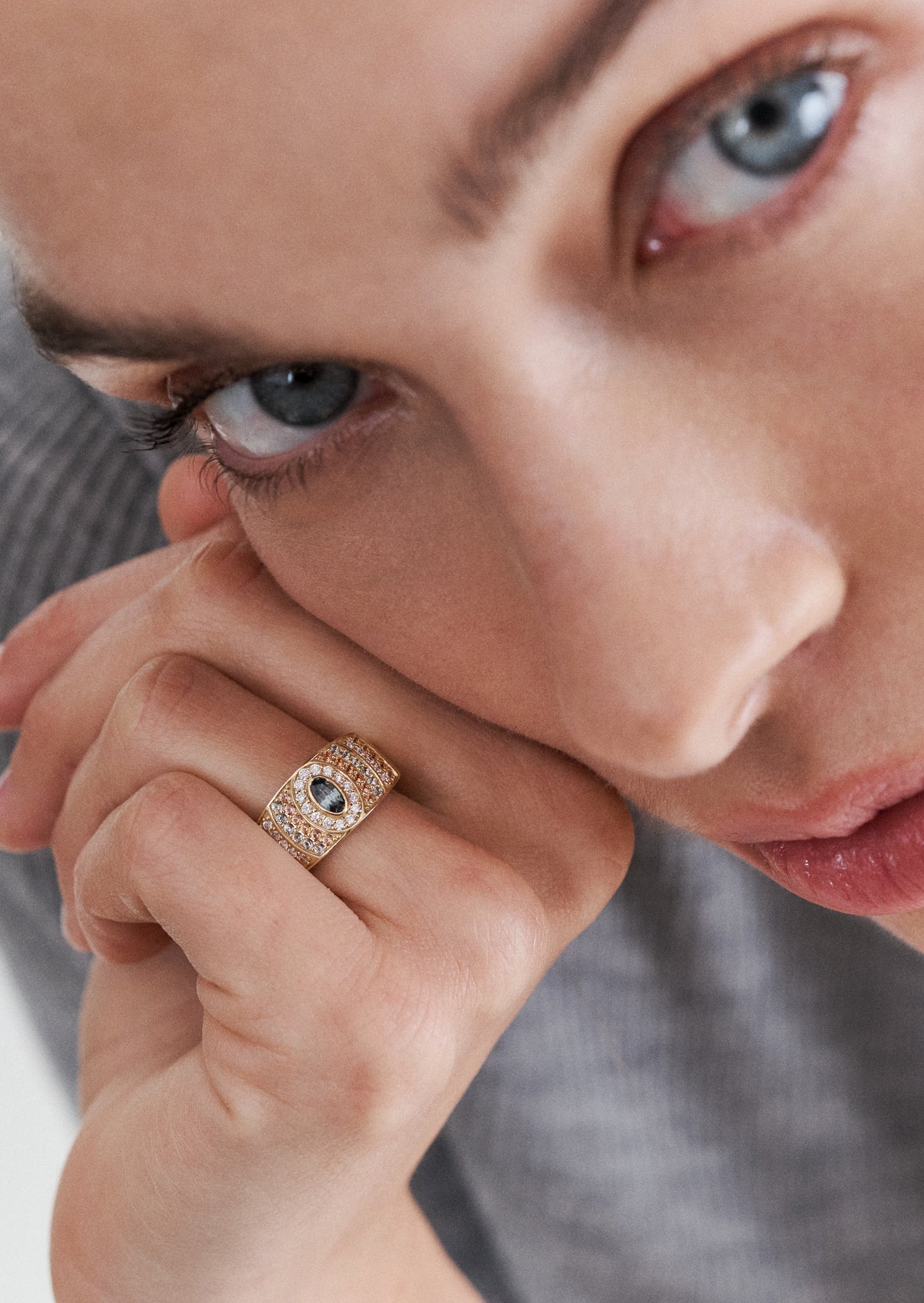 Bague Ani 4 Sable en or 18k avec saphirs vert tilleul, saphirs cognac, saphir vert, diamant blanc profil