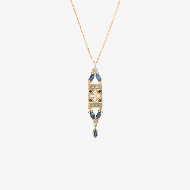 Precious details, an elegant shape and a vintage look ... the Ava Marine necklace has everything of a timeless piece. A soft mix of midnight blue and sky blue sapphires, illuminated with a touch of diamond.