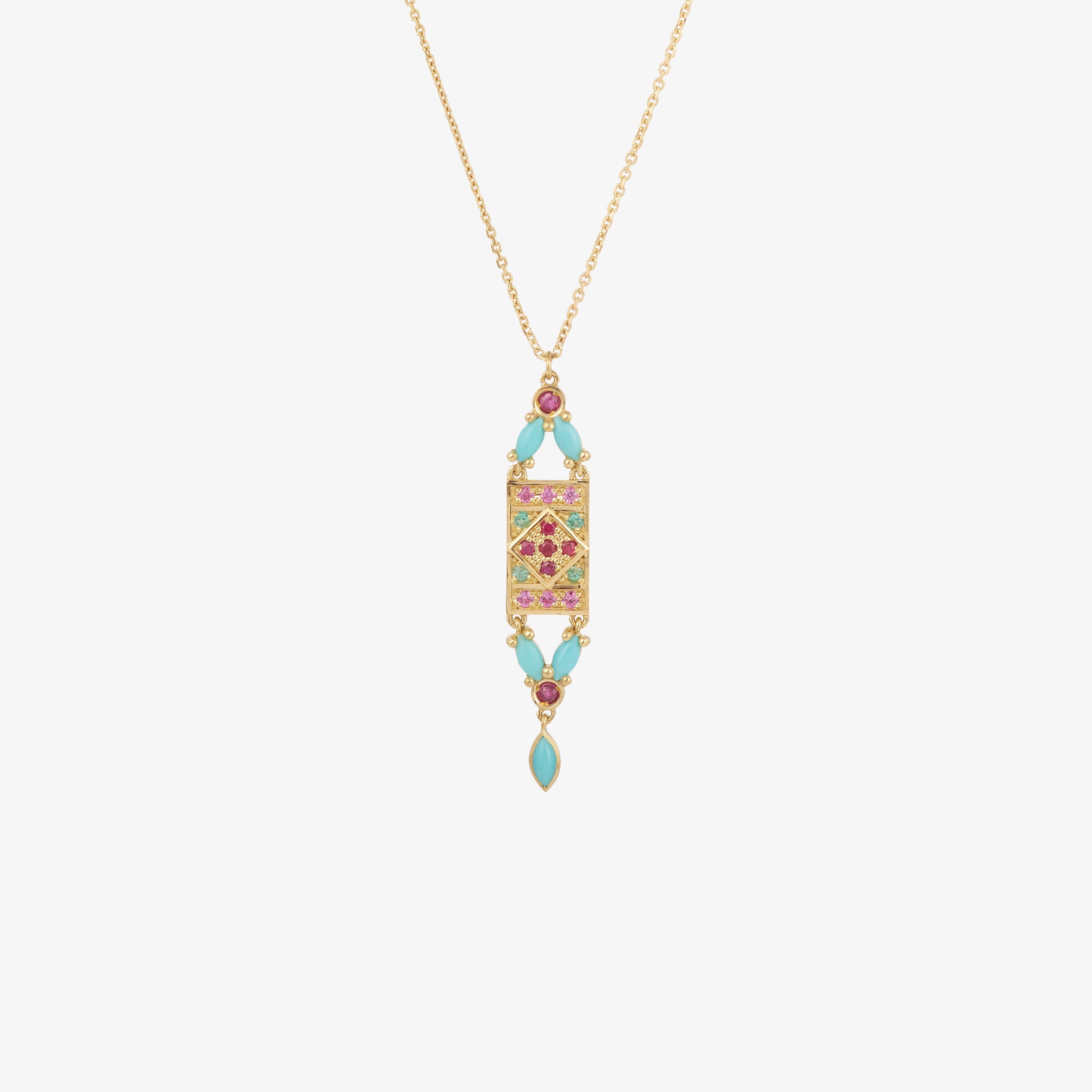 Delicate and vibrant, the Ava necklace 1 sublimates your neckline with lightness. Sparkling rubies, flaming emeralds and pink sapphires celebrate colorful jewelry. Between light and shadow, turquoise stones underline the brilliance of the gems. A necklace that spices up any look.