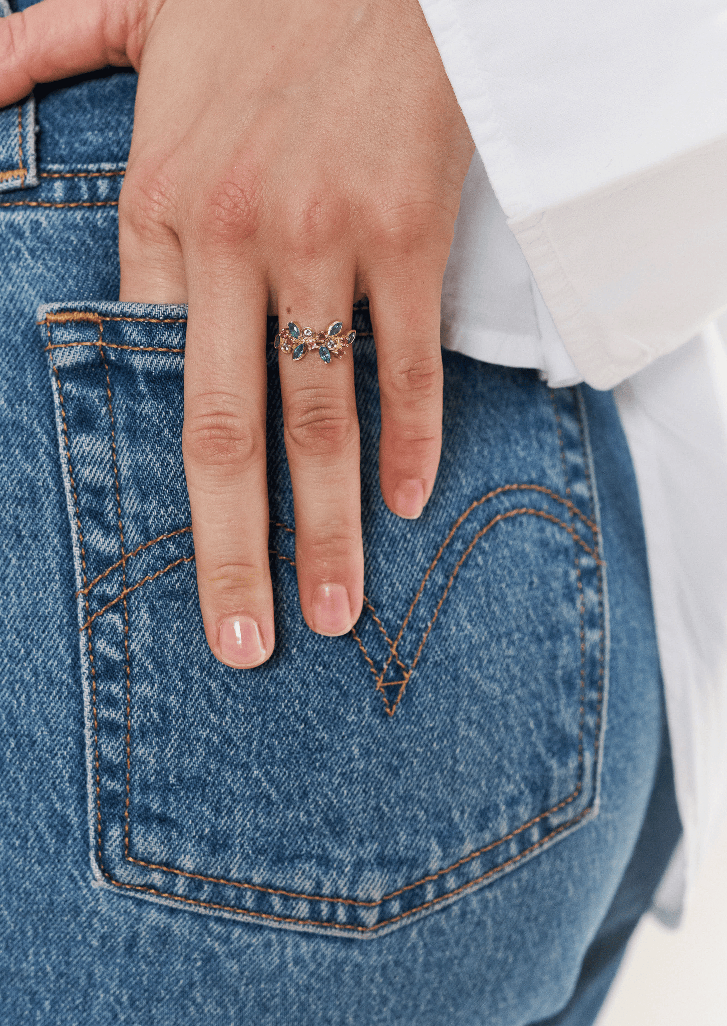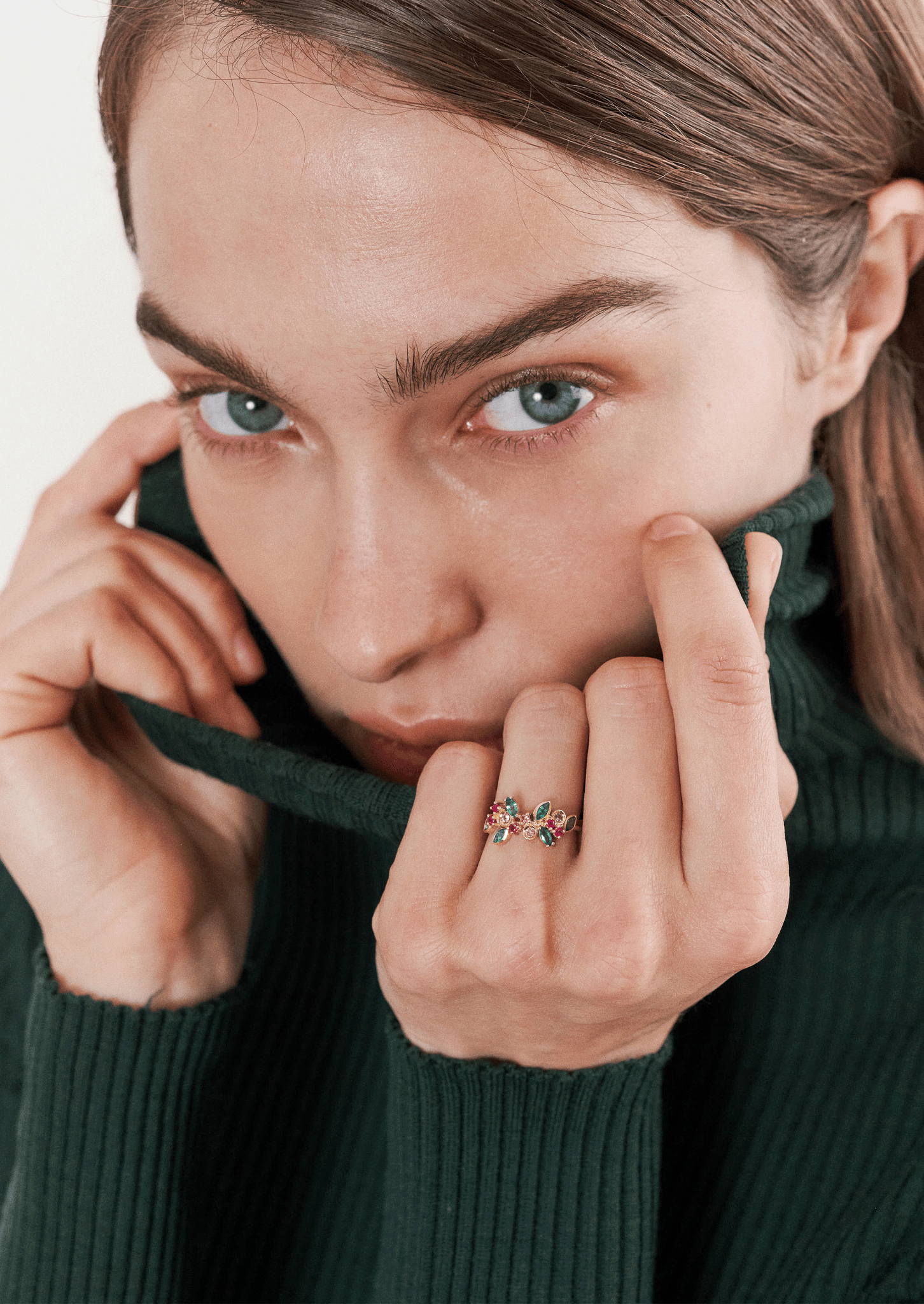 The Camélia ring 1 Pink will adorn your hand with a delicate garland of ruby and pink sapphire flowers, punctuated with emerald leaves. A stunning look with lush colors for a feminine and romantic design. This piece celebrates eternal love whose sparkle never fades, and is ideal as an engagement ring or as a gift for a wedding anniversary.