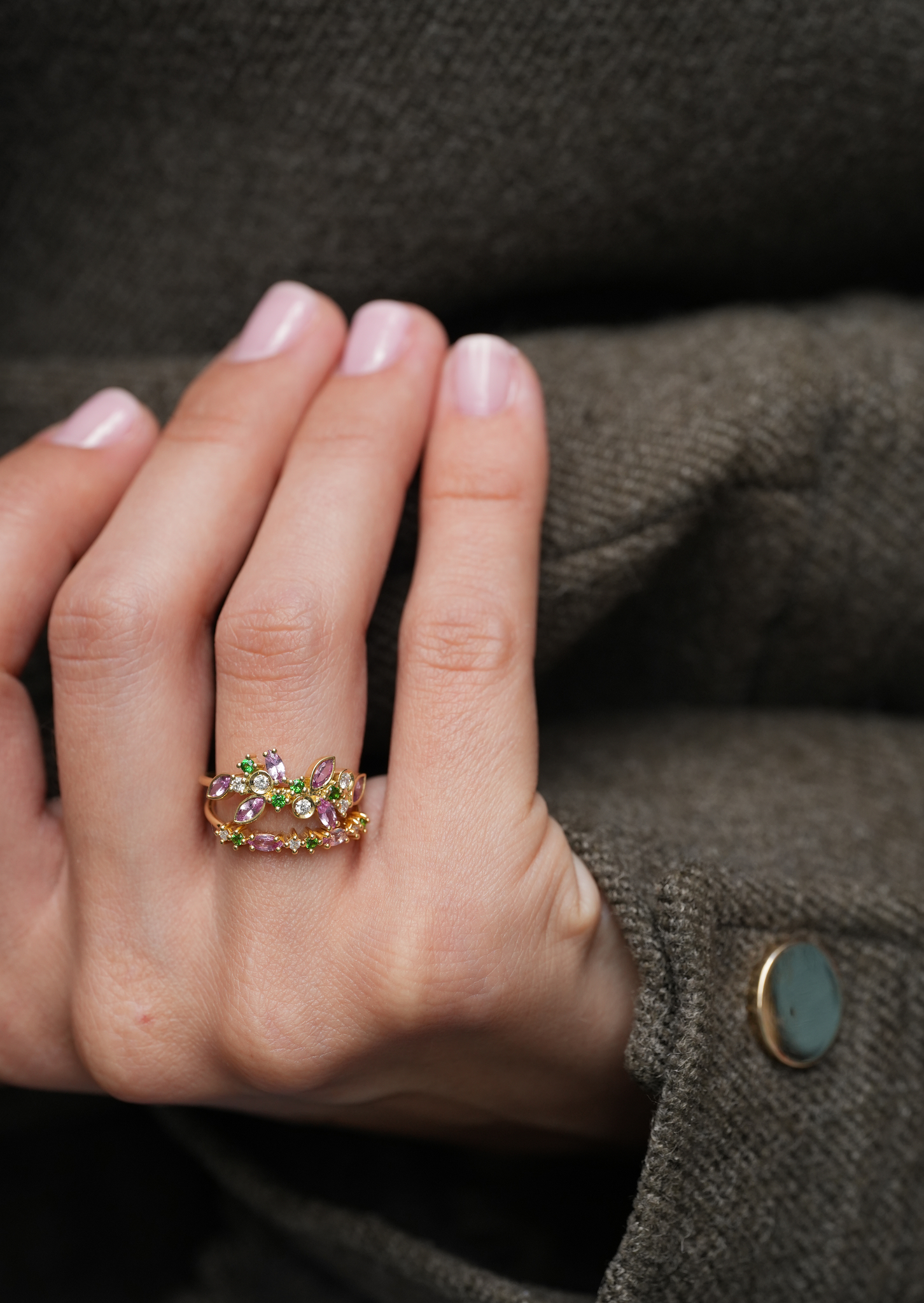Delicate and feminine, the Camélia Ring 1 Peony blooms with soft springtime hues. Pink sapphires, vibrant tsavorites, and sparkling diamonds come together in a fresh, floral harmony. A luminous creation that evokes the gentle beauty of a garden in full bloom.