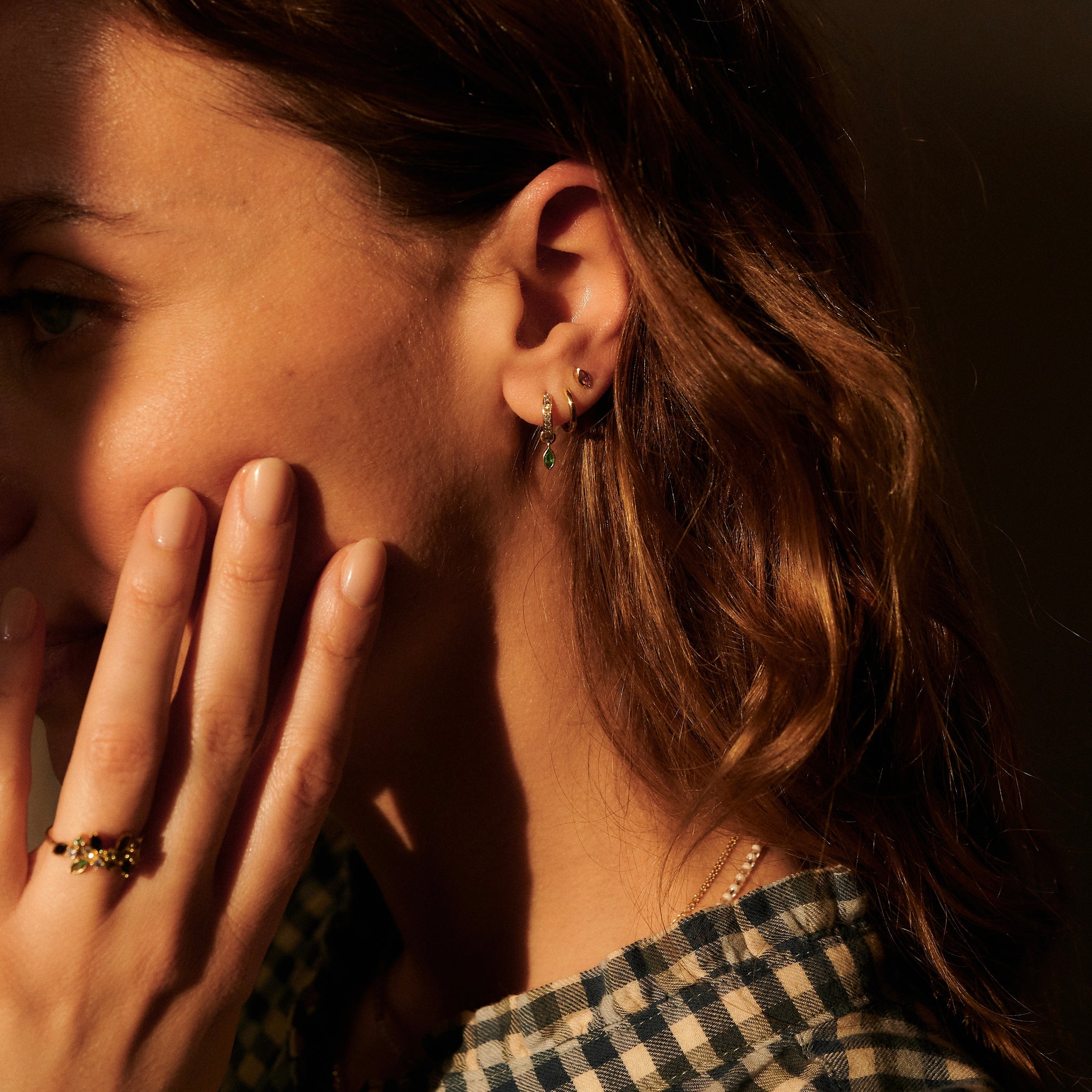 The Georgia ear stud features a precious pink sapphire leaf circled in gold. Its discreet design makes it an ideal ear jewel to be worn next to a bolder piece.