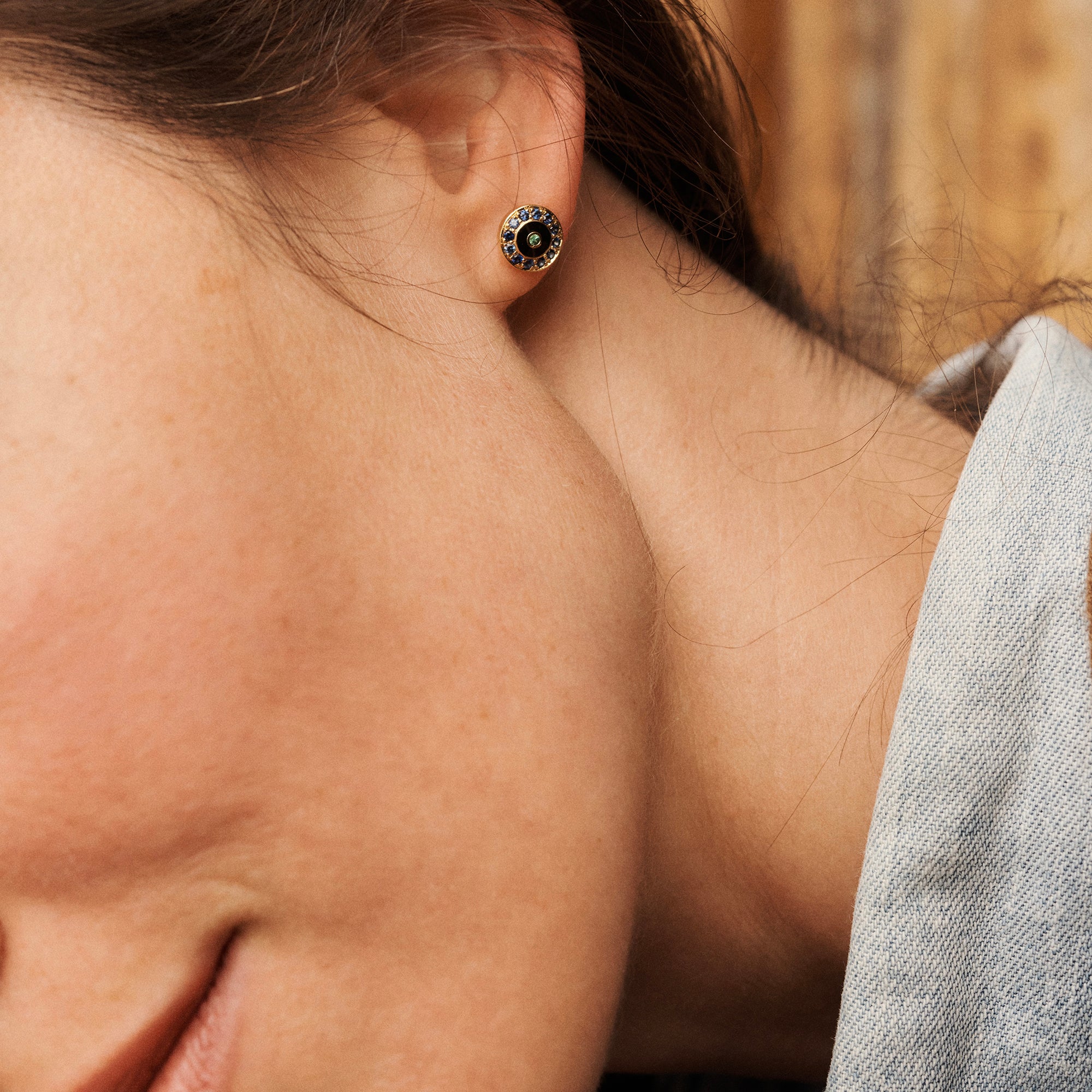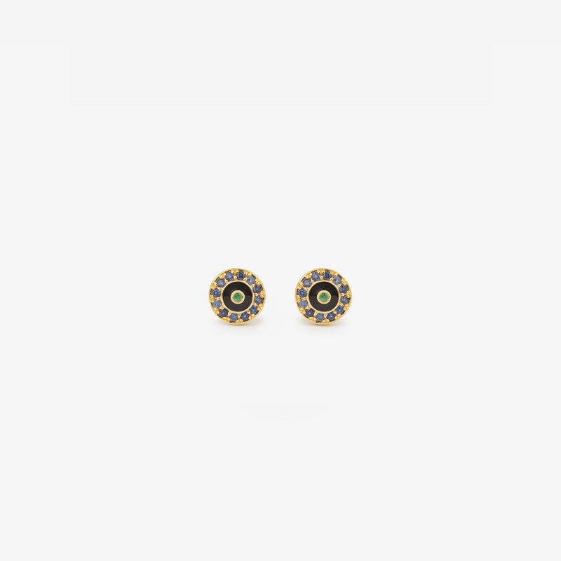 Refined and timeless, the Luna green stud earrings add a subtle and precious touch to your everyday looks. A circle of intense black enamel, enhanced by an emerald and 12 midnight blue sapphires. They are perfectly sized to accompany you day and night.
