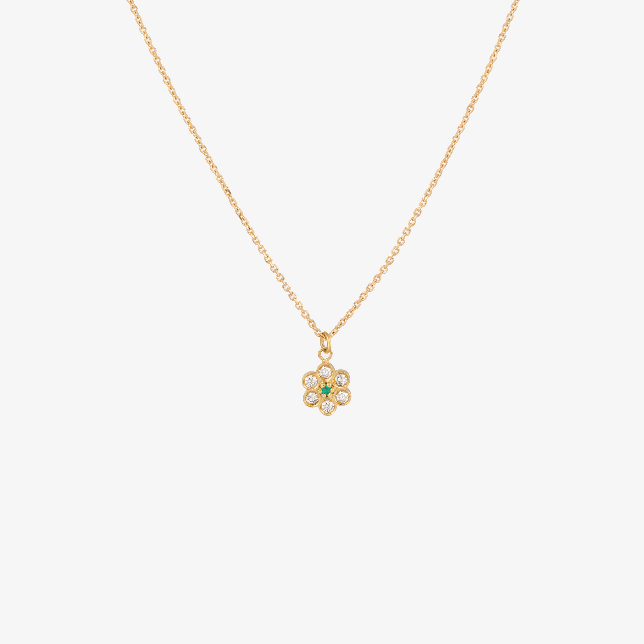 Precious and sparkling, the Miniflower necklace Mist delicately places on your skin a flower of "salt and pepper" diamonds highlighted by an emerald heart. Ideal for a first jewel, this necklace seduces by its softness and its femininity. The Miniflower necklace blends harmoniously with other necklaces, an opportunity to play with lengths and shapes.