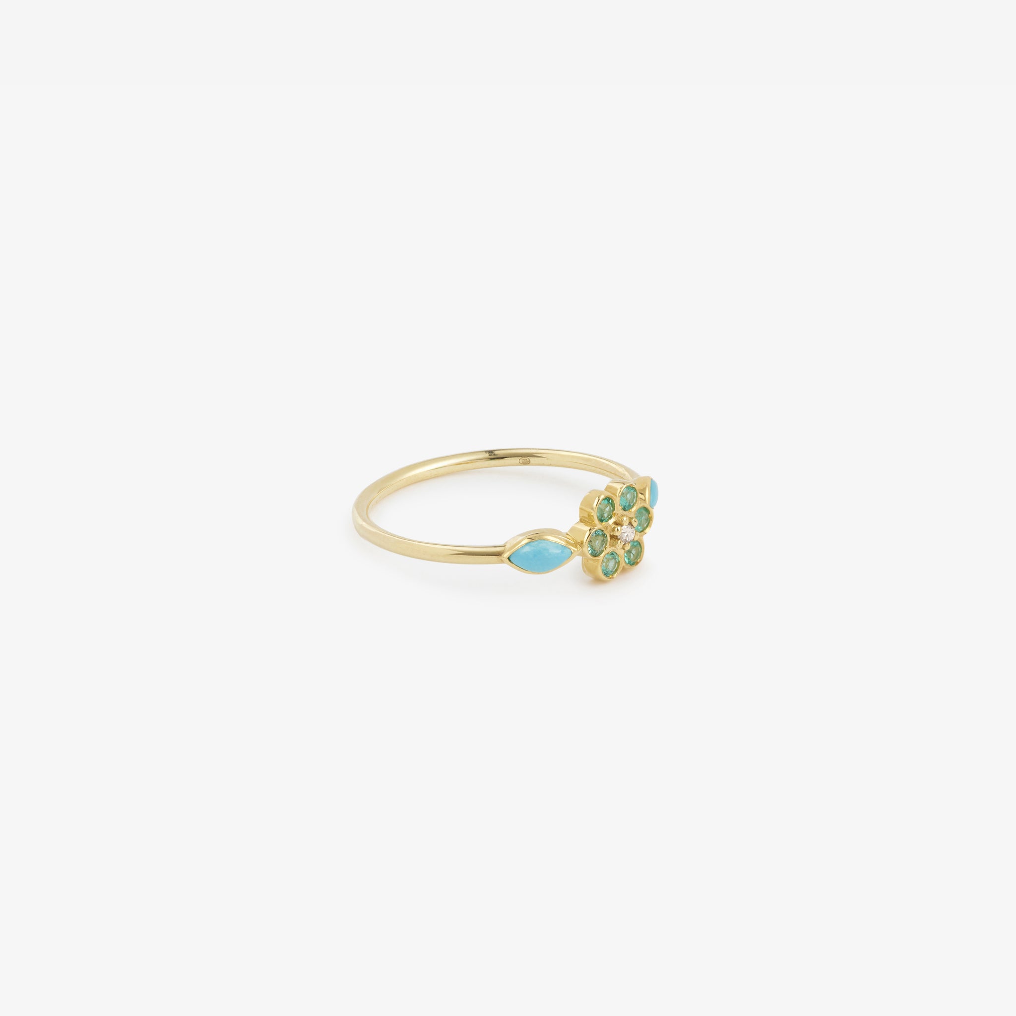 Bague Miniflower 1 turquoise or jaune, émeraudes et turquoise face