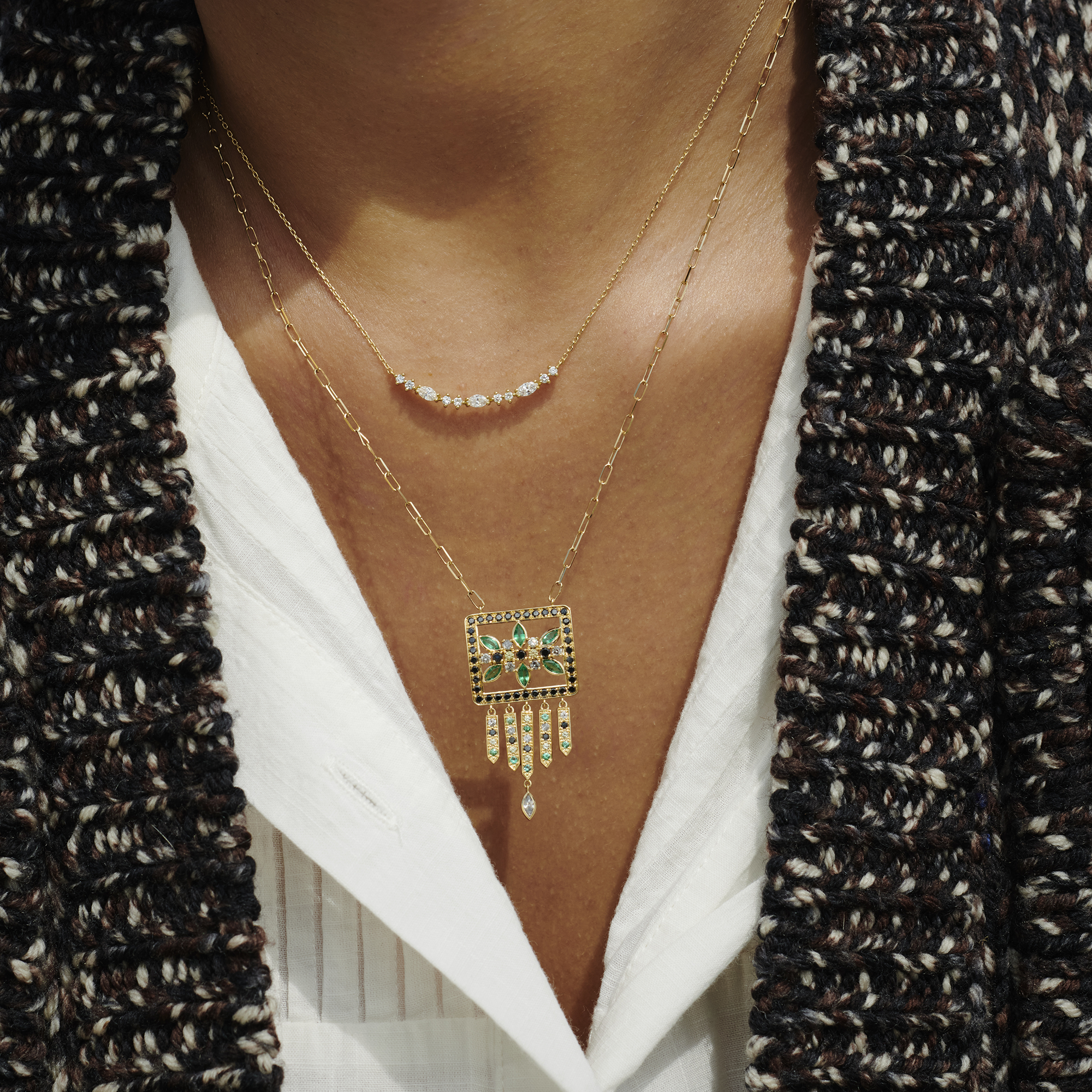 Elegant and graceful, the Rita necklace is worn like a talisman. An openwork pendant revealing the skin. We love the suspended bangs set with stones, airy and delicate, which dances to the rhythm of your movements. A jewel of timeless colors, skilfully blending emeralds and yellow sapphires with black and salt and pepper diamonds.