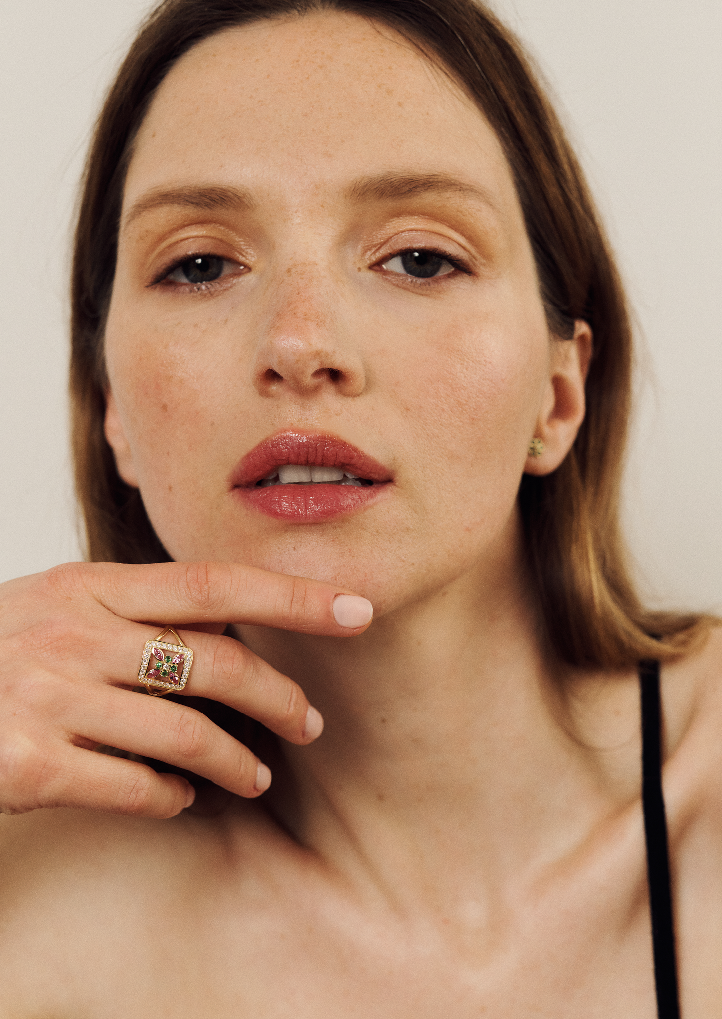 The Rita Ring 4 Peony combines the intensity of tsavorites, the sparkle of diamonds, and the softness of pink sapphires.